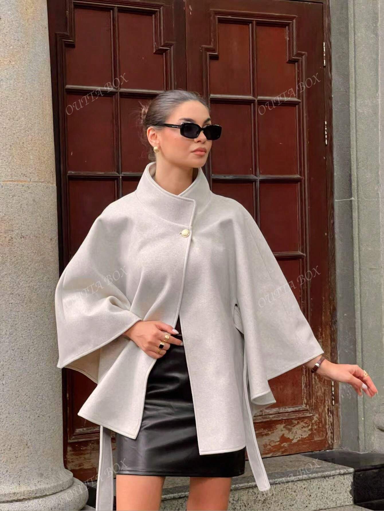 Elevate your outerwear game with the Wool Blend Poncho Coat. Crafted from a luxurious wool blend, this piece offers ultimate warmth and sophistication in a relaxed, elegant silhouette. The oversized poncho design drapes effortlessly over the body, while the waist tie cinches to create a flattering, tailored shape. Finished with a subtle gold button and a high-neck collar, this coat strikes the perfect balance between cozy comfort and chic, modern style. Whether layered over a casual outfit or paired with a dress for a night out, it's an essential statement piece for your wardrobe.