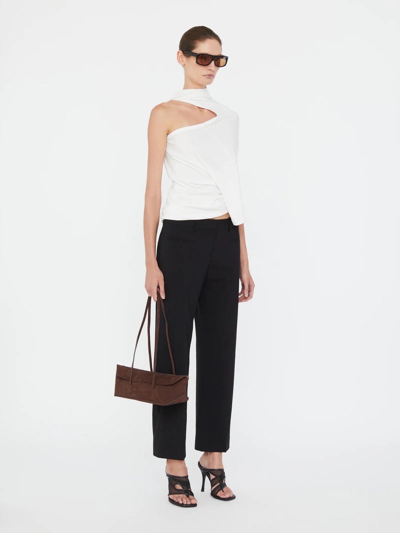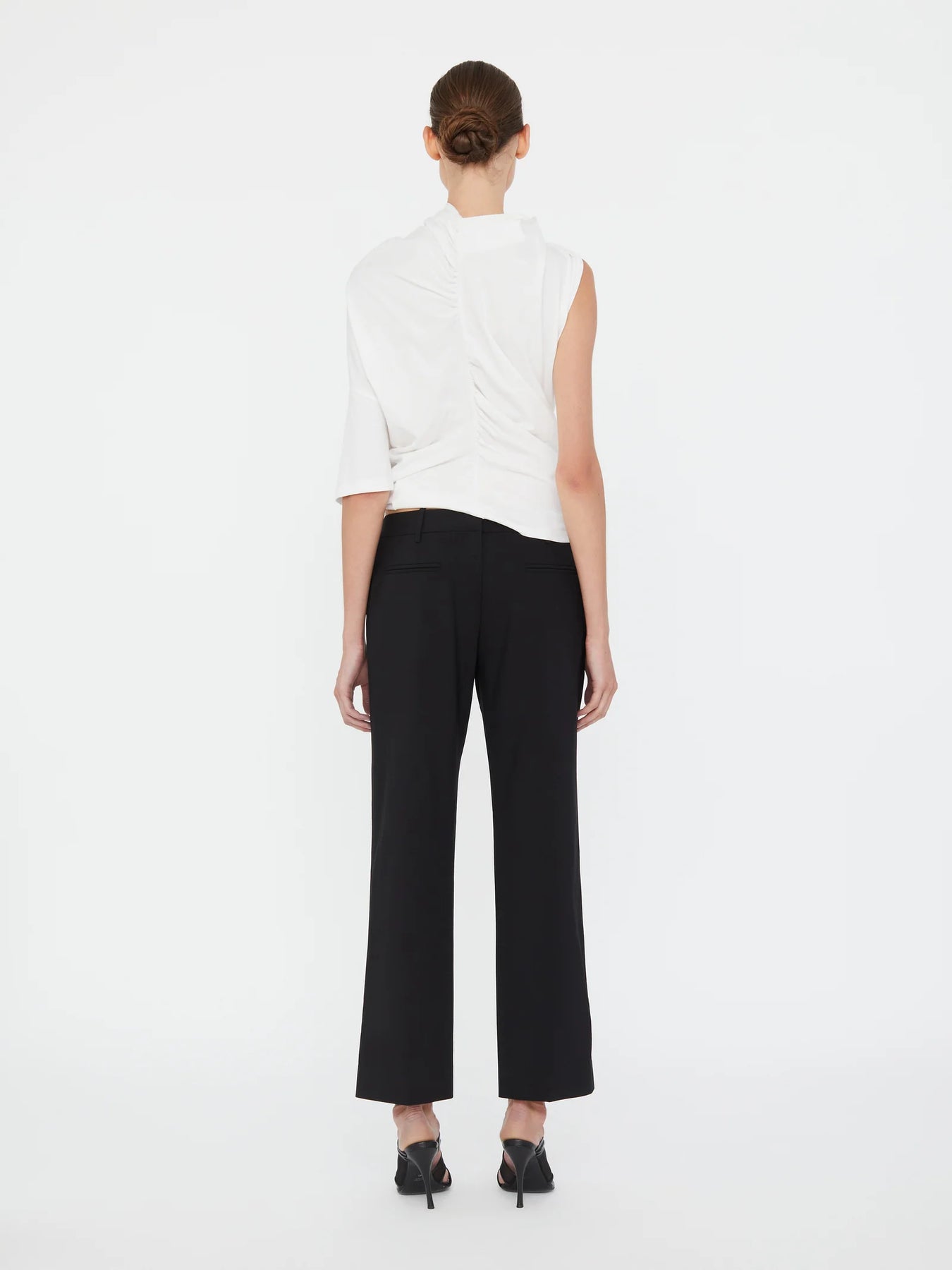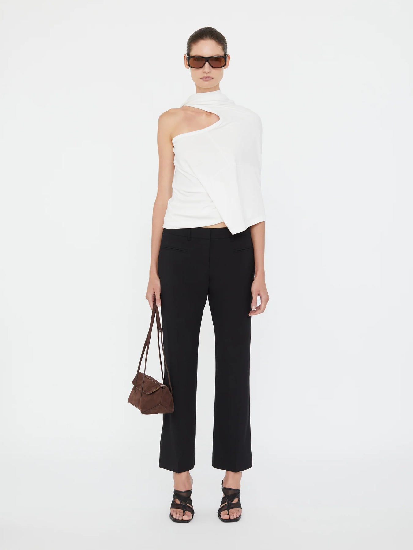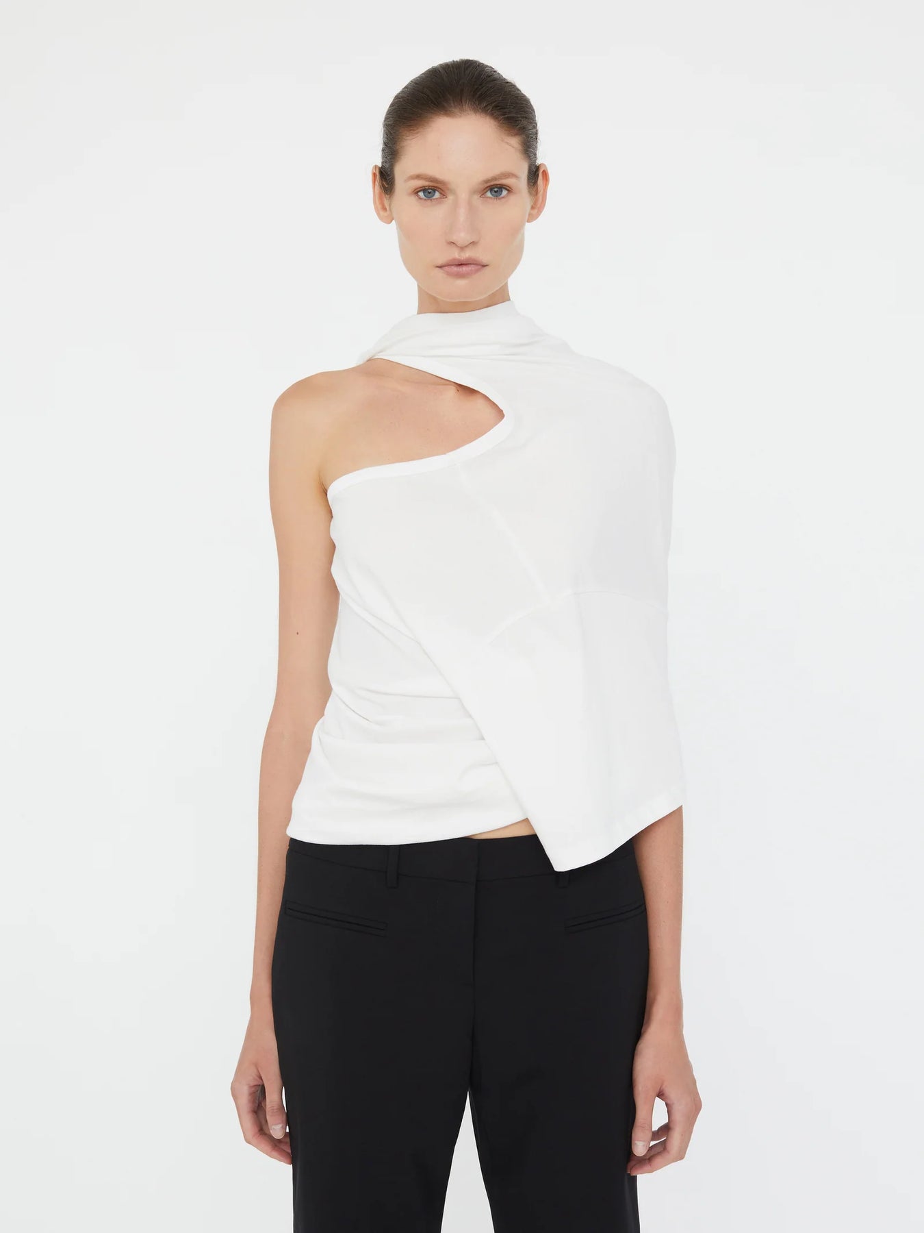 This asymmetric top pairs clean lines with an architectural neckline. A scarf-like collar wraps the neck and creates a cutaway at the collarbone, while gentle ruching through the body shapes and flatters. One shoulder is covered with a relaxed short sleeve; the other sits bare for a modern, high-contrast look.